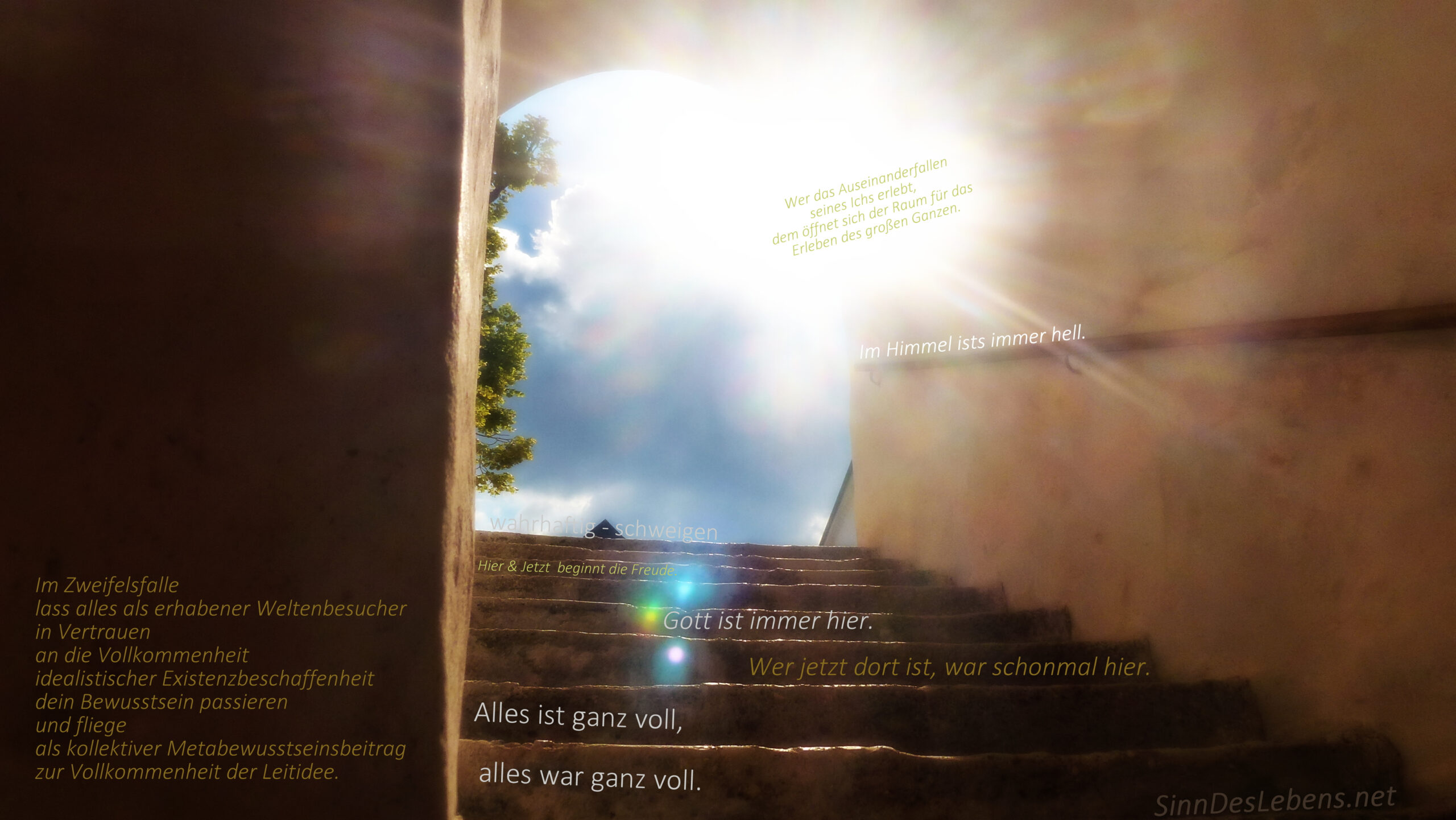 Im Zweifelsfalle lass alles als erhabener Weltenbesucher in Vertrauen an die Vollkommenheit idealistischer Existenzbeschaffenheit  dein Bewußtsein passieren, und fliege als kolllektiver Metabewußtseinsbeitrag zur Vollkommenheit der Leitidee